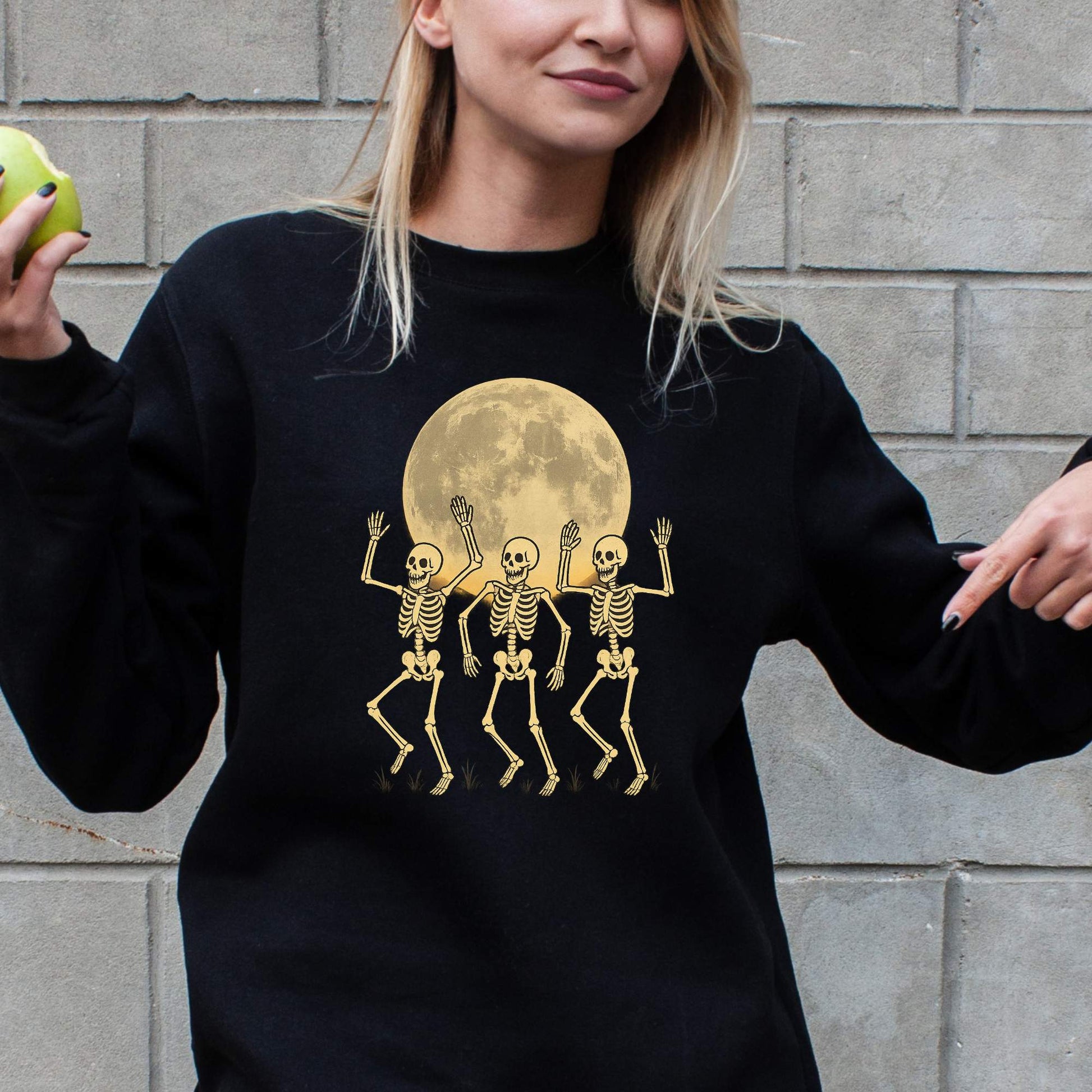 Celebrate spooky season in style with the 3 Dancing Skeletons sweatshirt. Featuring three playful skeletons grooving under a glowing moon, this cozy sweatshirt brings fun and festive vibes to your wardrobe. Perfect for staying warm while showing off your quirky side, it’s a must-have for Halloween or any day you want to dance with the undead.